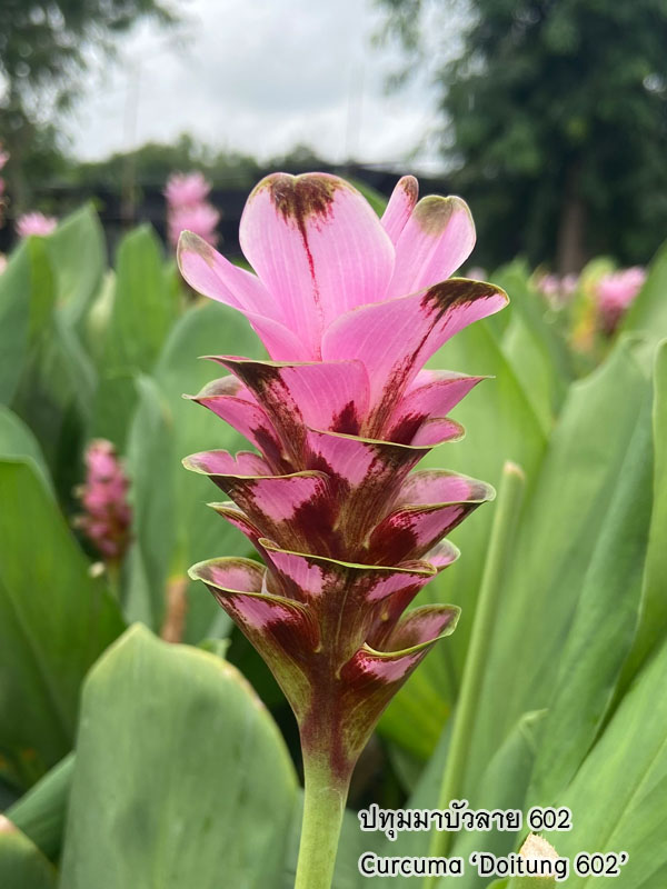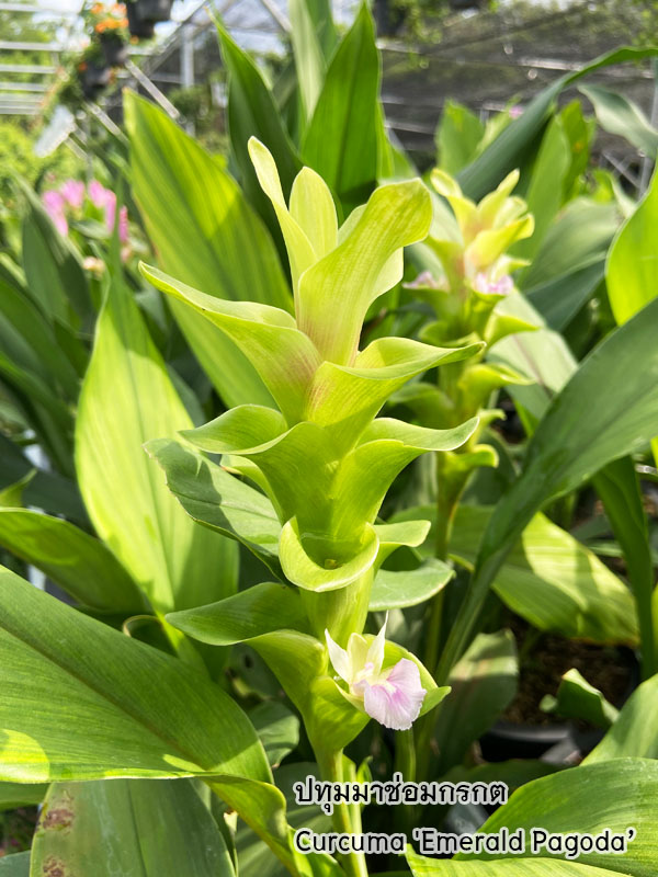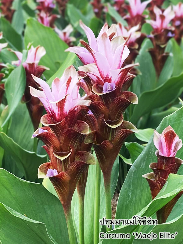 ช่อดอกเป็นแบบ spike ชูตั้งขึ้นจากโคนต้น ประกอบด้วยใบประดับ bract เรียงซ้อนกันอย่างเป็นระเบียบเป็นรูปทรงกรวยหรือวงรี สีชมพูอมม่วง ชมพูเข้ม หรือขาว